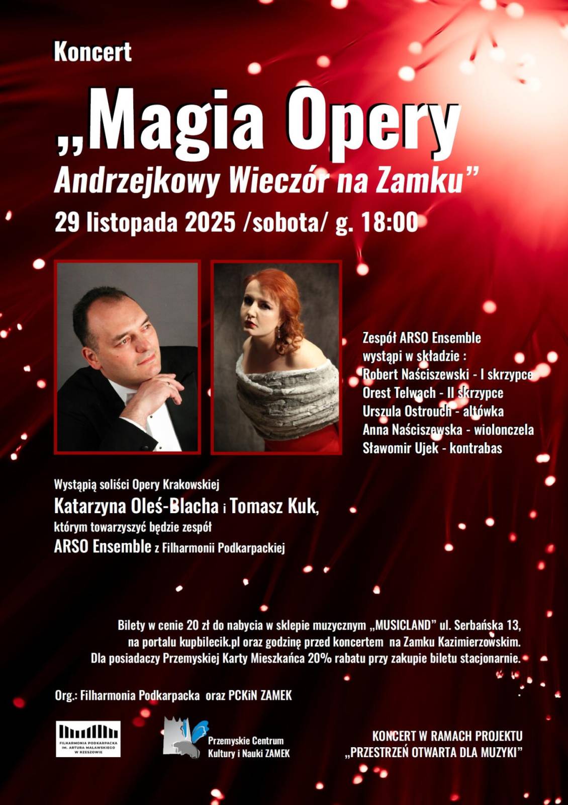 Na scenie wystąpią znakomici soliści, gwiazdy Opery Krakowskiej – Katarzyna Oleś-Blacha (sopran) oraz Tomasz Kuk (tenor), którym towarzyszyć będzie zespół ARSO Ensemble z Filharmonii Podkarpackiej w składzie: Robert Naściszewski – I skrzypce, Orest Telwach – II skrzypce, Urszula Ostrouch – altówka, Anna Naściszewska – wiolonczela i Sławomir Ujek – kontrabas. Artyści zabiorą Państwa w muzyczną podróż od Wiednia po Neapol, wypełnioną pasją, elegancją i uśmiechem – tak, jak przystało na ten wyjątkowy, magiczny wieczór.