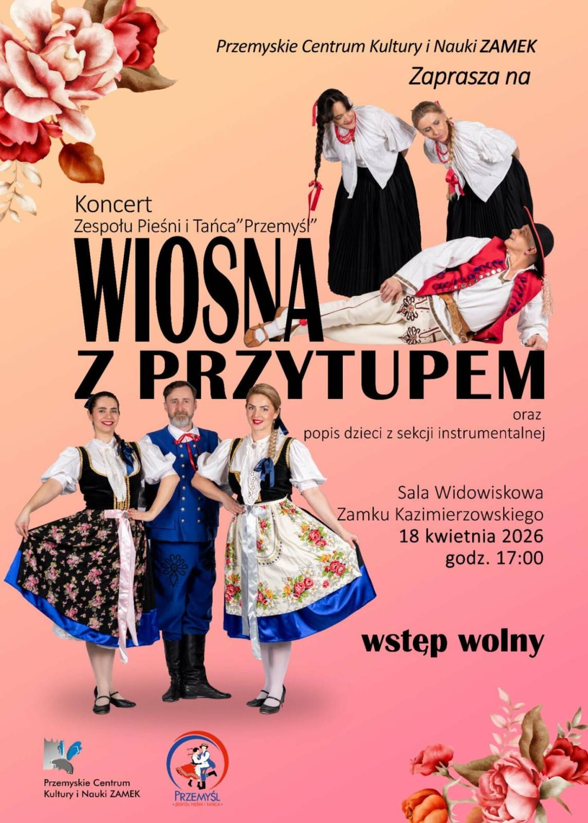 W sobotę 18 kwietnia 2026 r. sala widowiskowa Zamku Kazimierzowskiego wypełni się dźwiękiem, ruchem i radością budzącej się do życia wiosny. Tego popołudnia zapraszamy Państwa na wyjątkowe wydarzenie zatytułowane „WIOSNA Z PRZYTUPEM” – koncert Zespołu Pieśni i Tańca „Przemyśl”, który wypełniony będzie energią, barwnością i autentycznością polskiej tradycji.